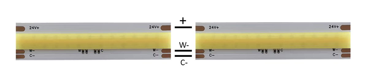 - Voit leikata tai jatkaa led nauhaa merkityistä kohdista. Suosittelemme tekemään jatkokset ja johtojen liitokset kolvaamalla, koska kokemuksemme mukaan pikaliittimet löystyvät ajan kanssa. Huomioi, että led nauhan merkinnät jatkuvat samanlaisina liitoksen molemmilta puolilta, eli + liitetään + kohtaan jne.