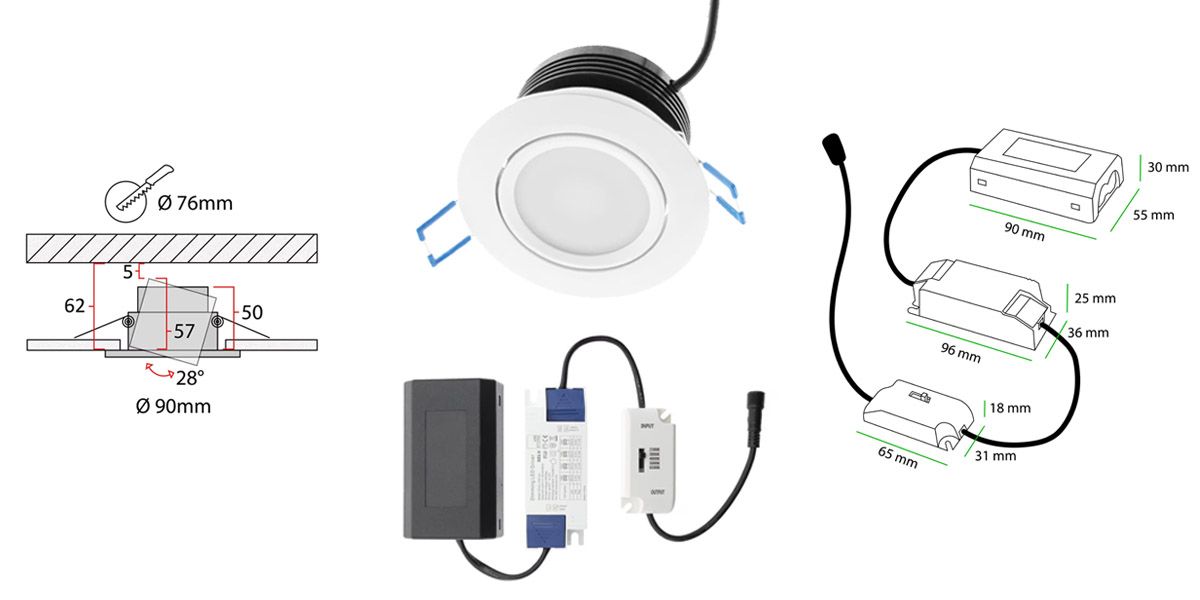 LedStoren spottien ja paneelien TRIAC himmennettävä perusmuuntaja, mahtuu aina valaisimen asennusaukosta katon sisään. Perusmuuntajassa on lisäksi ketjutettava kytkinrasia, sekä valon värilämpötilan valitsin.